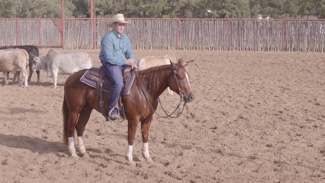 Body position is important for you as a rider. RL explains how riders have a tendancy to lean in an effort to control the cow with his or her body. Keeping your body centered will give you maximum control on the cow while your horse performs.