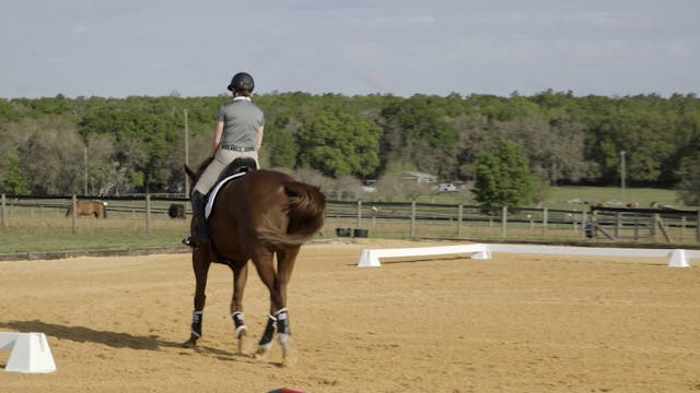 Stephany watches as they move into rising trot. She makes some observations as to how the rider is posting and how that relates to the horse's length of stride. They work on increasing and decreasing the horse's trot stride through small changes in the rider's motion.