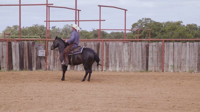 Winston Hansma simulates what working with a 2-year-old on a flag looks like. He demonstrates how he works on the fundamentals with the horse to help him grow in his training and use his hands in accordance with his feet.